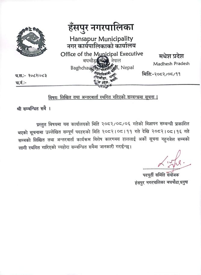 - लिखित तथा अन्तर्वार्ता स्थगित गरिएको सूचना ।