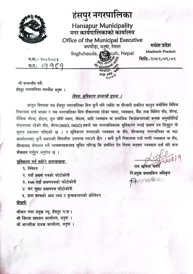 - हंसपुर नगरपालिकाको ईन्धन वितरण सम्बन्धी कार्यविधि,२०८१